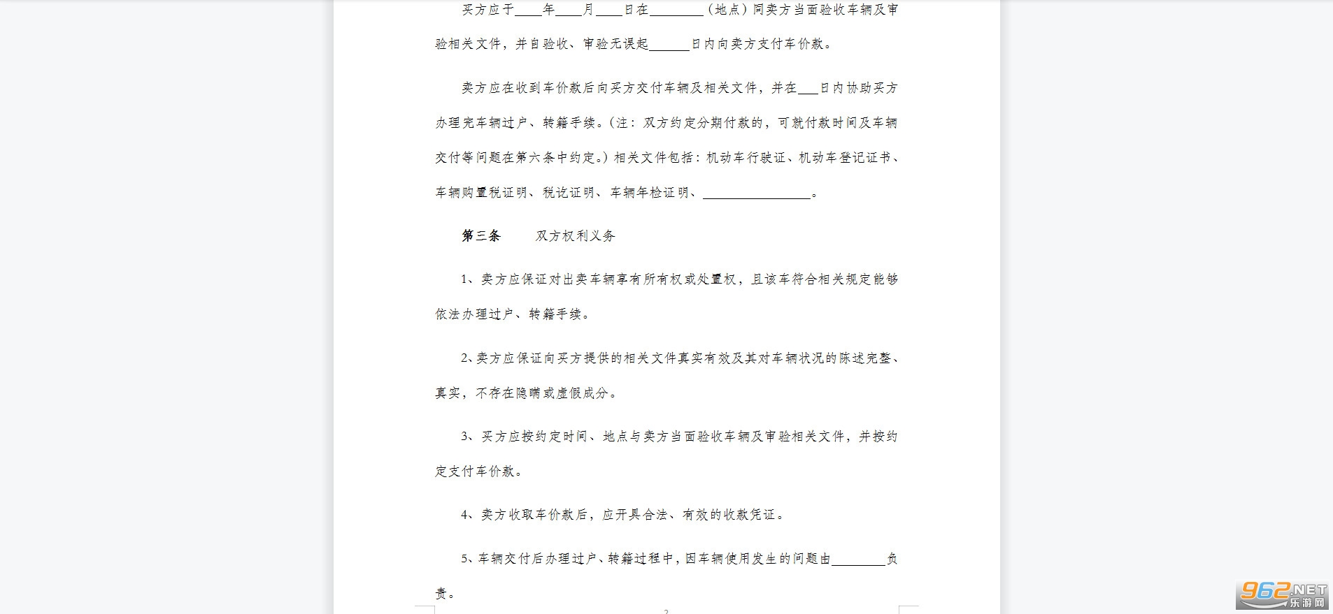 2、卖方应保证向买方提供的相关文件真实有效及其对车辆状况的陈述完整、真实,不存在隐瞒或虚假成分。