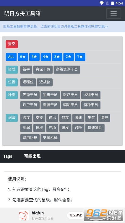 《明日方舟公开招募计算器bigfun》是专门为明日方舟玩家专门打造的一款辅助性工具,可以在其中模拟游戏中的公开招募系统操作,筛选方舟角色tag测试各个星级角色的概率有多大。在明日方舟tag公开招募计算器中,玩家们至多模拟挑选6个不同的兵种,然后根据自己的任务需求去进行厕所,得出最终的结果!