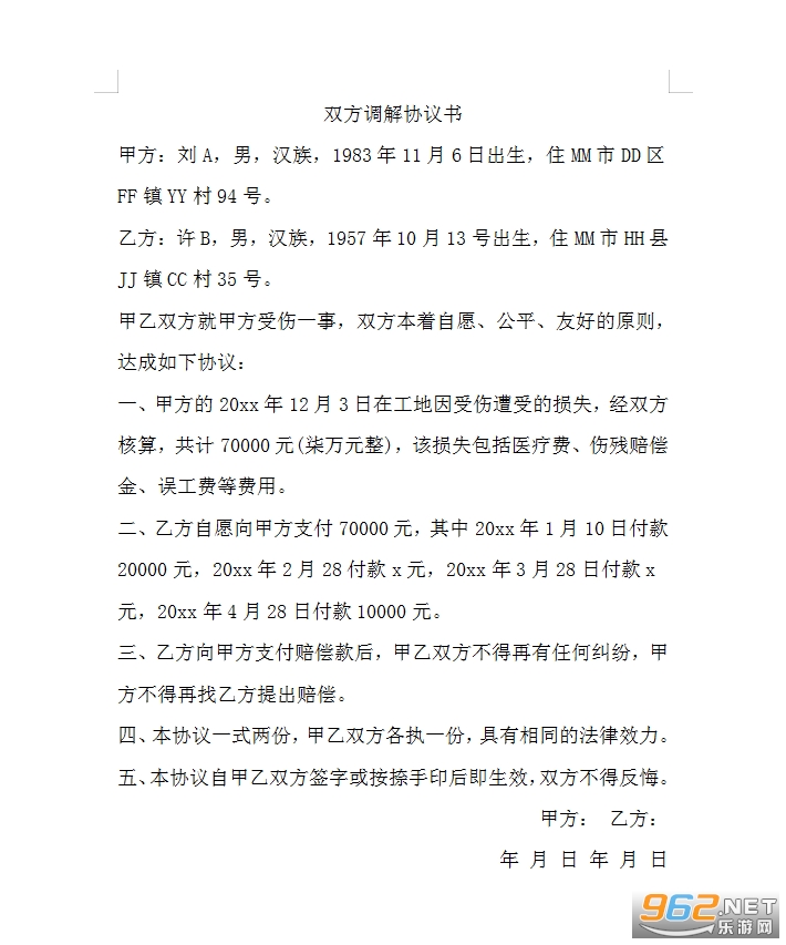 乙方:许B,男,汉族,1957年10月13号出生,住MM市HH县JJ镇CC村35号。