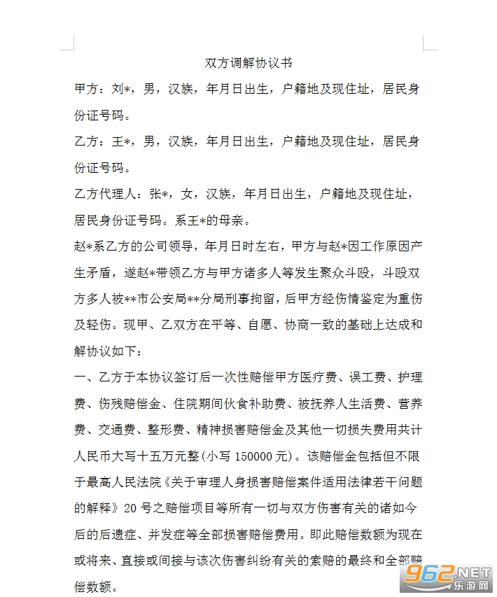 一、乙方于本协议签订后一次性赔偿甲方医疗费、误工费、护理费、伤残赔偿金、住院期间伙食补助费、被抚养人生活费、营养费、交通费、整形费、精神损害赔偿金及其他一切损失费用共计人民币大写十五万元整(小写150000元)。该赔偿金包括但不限于最高人民法院《关于审理人身损害赔偿案件适用法律若干问题的解释》20号之赔偿项目等所有一切与双方伤害有关的诸如今后的后遗症、并发症等全部损害赔偿费用。即此赔偿数额为现在或将来、直接或间接与该次伤害纠纷有关的索赔的最终和全部赔偿数额。