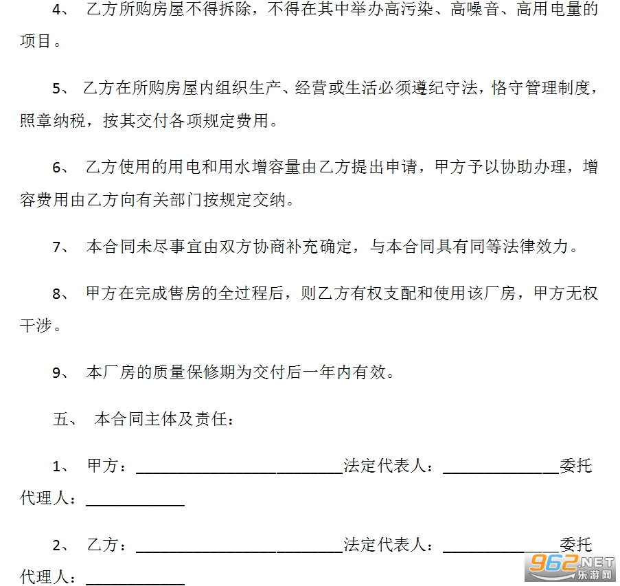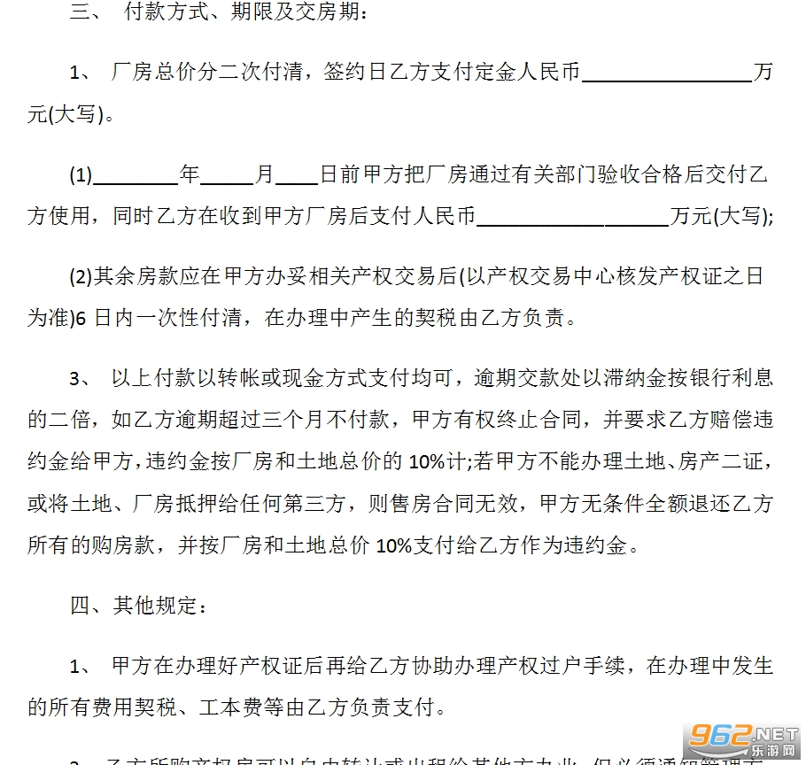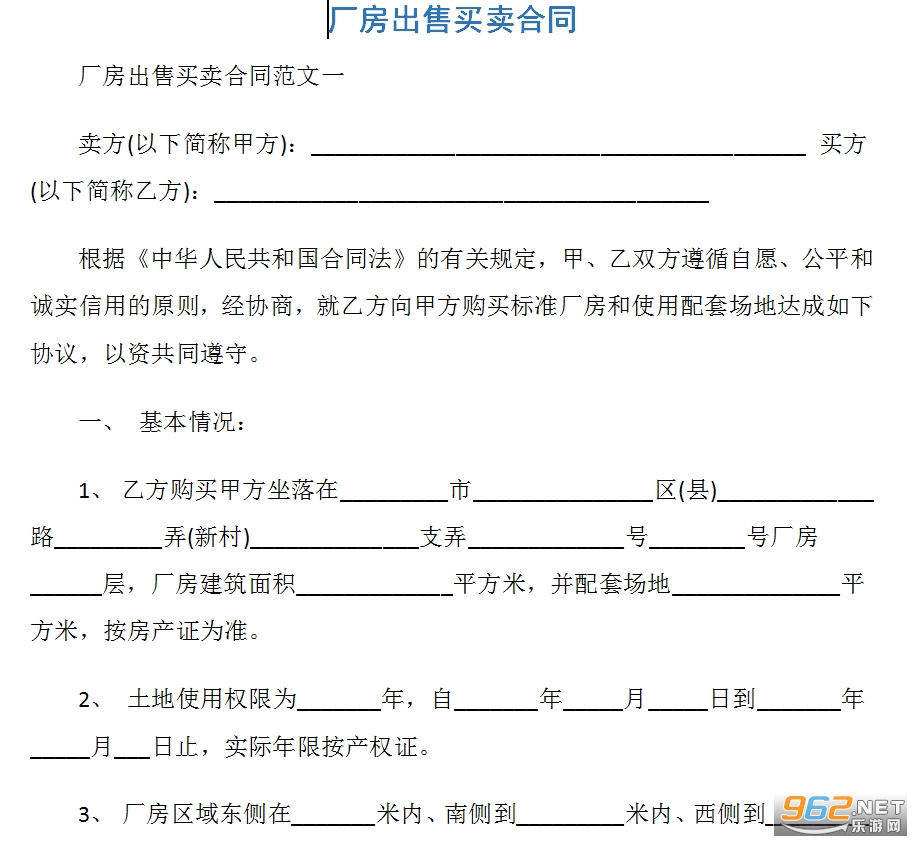 1、 乙方购买甲方坐落在_________市_______________区(县)_____________路_________弄(新村)______________支弄_____________号________号厂房______层,厂房建筑面积_____________平方米,并配套场地______________平方米,按房产证为准。