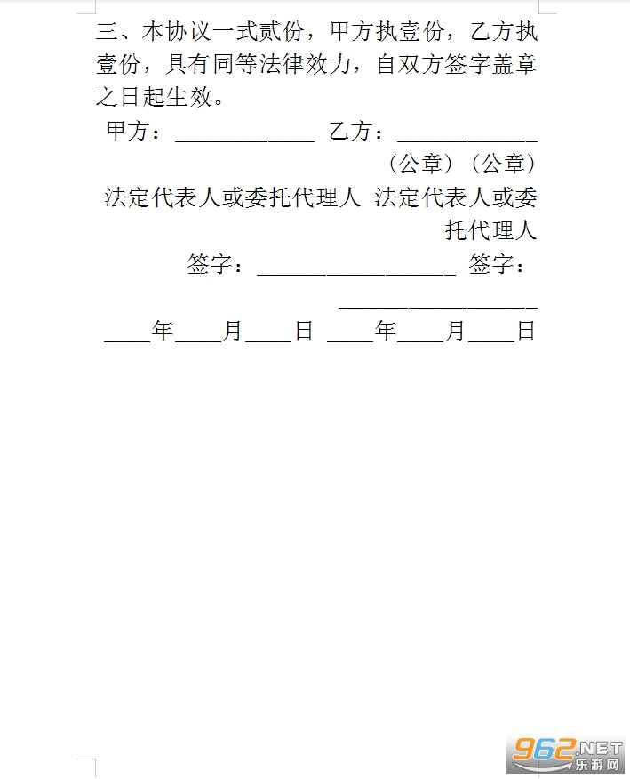 三、本协议一式贰份,甲方执壹份,乙方执壹份,具有同等法律效力,自双方签字盖章之日起生效。
