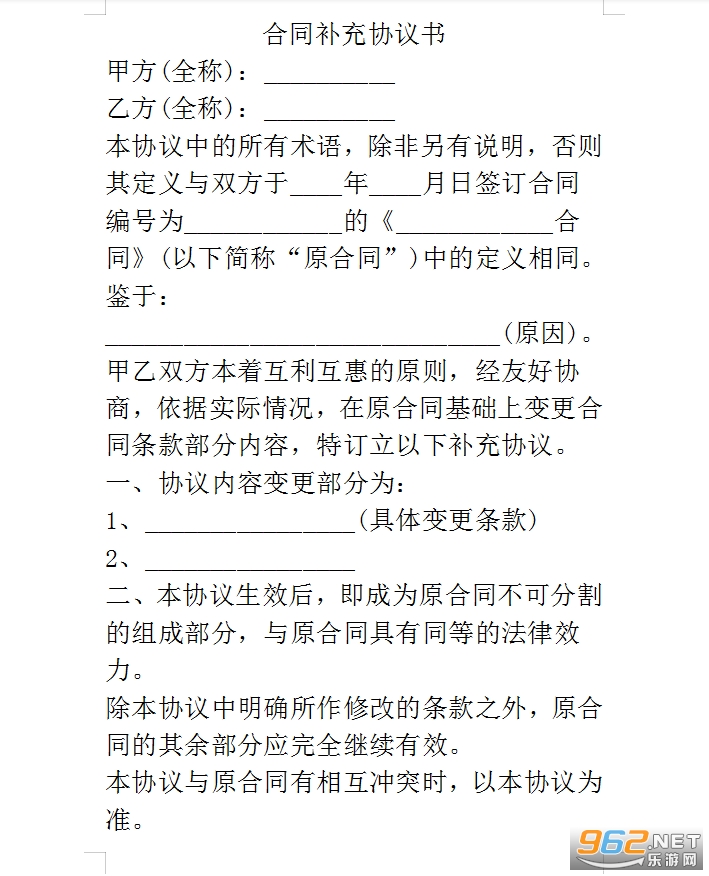 (原因)甲乙双方本着互利互惠的原则,经友好协商,依据实际情况,在原合同基础上变更合同条款部分内容,特订立以下补充协议。