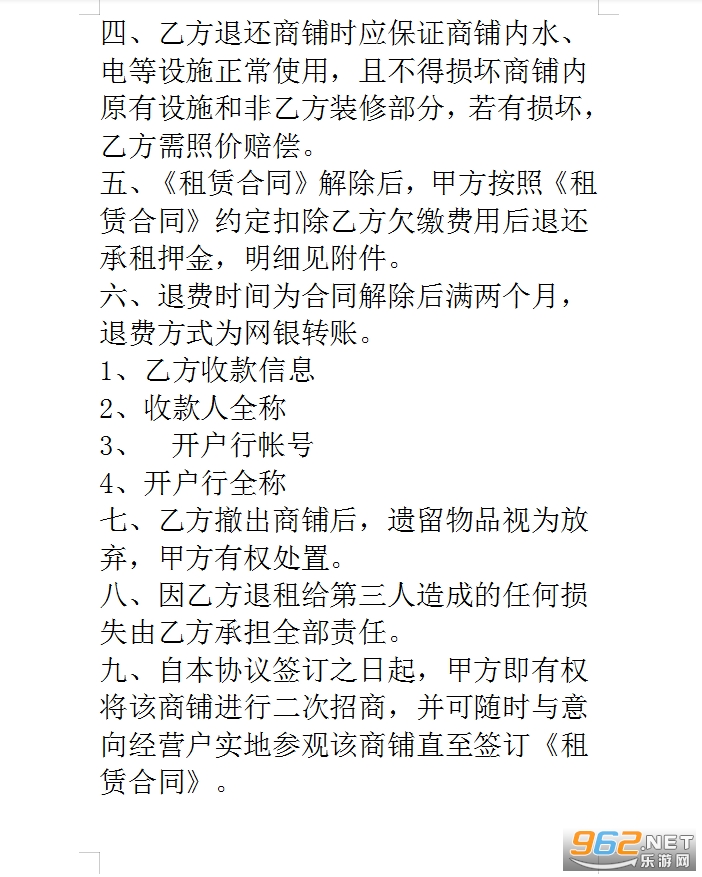 七、乙方撤出商铺后,遗留物品视为放弃,甲方有权处置。