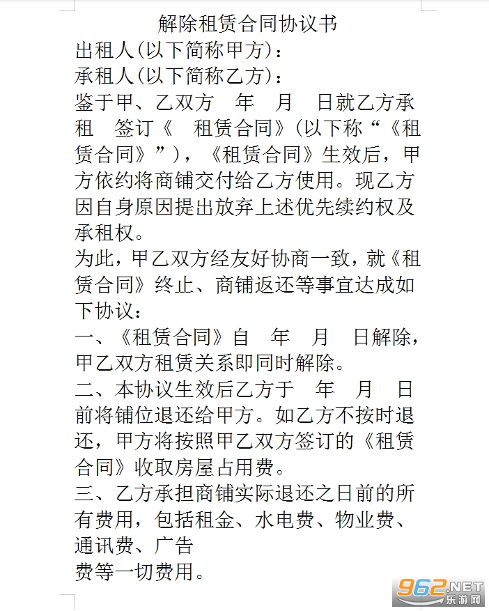 鉴于甲、乙双方 年 月 日就乙方承租 签订《 租赁合同》(以下称“《租赁合同》”),《租赁合同》生效后,甲方依约将商铺交付给乙方使用。现乙方因自身原因提出放弃上述优先续约权及承租权。