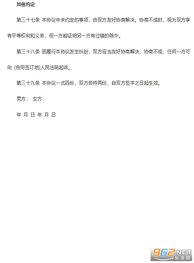第三十七条 本协议中未约定的事项,由双方友好协商解决。协商不成时,视为双方享有平等权利和义务,但一方能证明另一方有过错的除外。