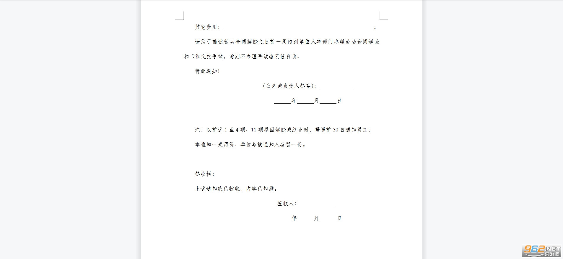 《解除/终止劳动合同通知书》当公司与劳动者终止劳动关系的时候需要提前30天下发。解除/终止劳动合同通知书能够到劳动局办理失业证,同时也和社保公积金等有关,双方协商以后就能够正式解除。