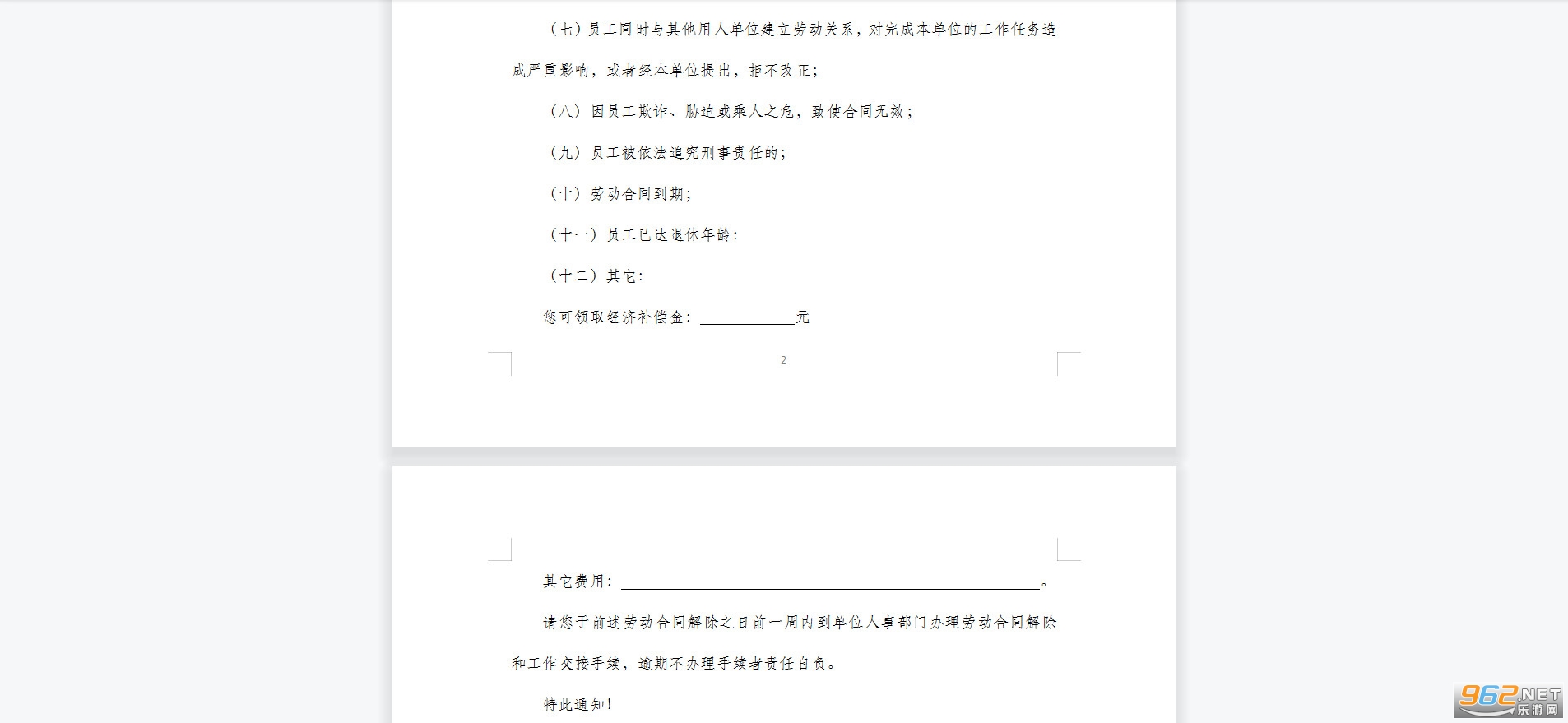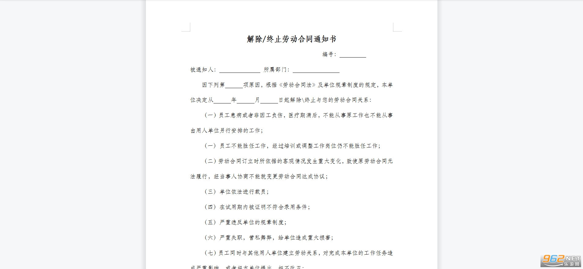 因下列第 项原因,根据《劳动合同法》及单位规章制度的规定,本单位决定从 年 月 日起解除终止与您的劳动合同关系: