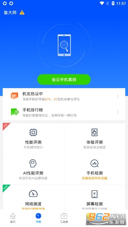 鲁大师评测是一款专业的手机性能测试软件,提供真假验证、手机跑分等功能,全面的掌握手机各项参数及性能,还可以一键加速提升运行流畅性,给用户最佳使用体验,1亿用户选择的手机硬件专家。