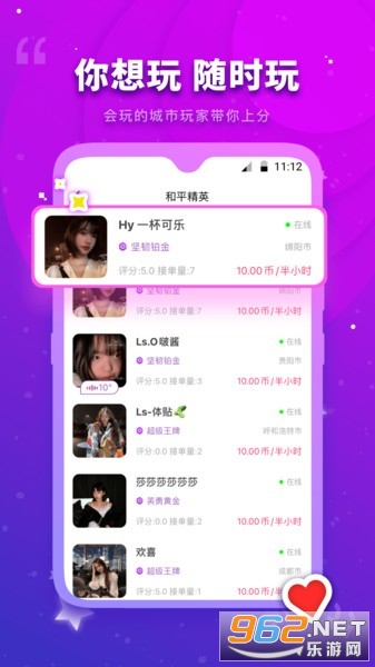 众多热门游戏(刺激战场、绝地求生、英雄联盟、王者荣耀等),由经严苛考核通过的游戏大神领头,满足上分上星吃鸡高玩需求。