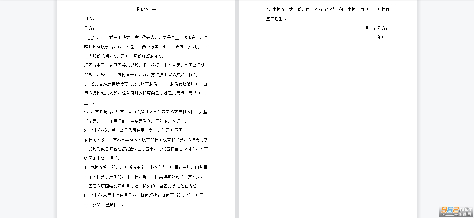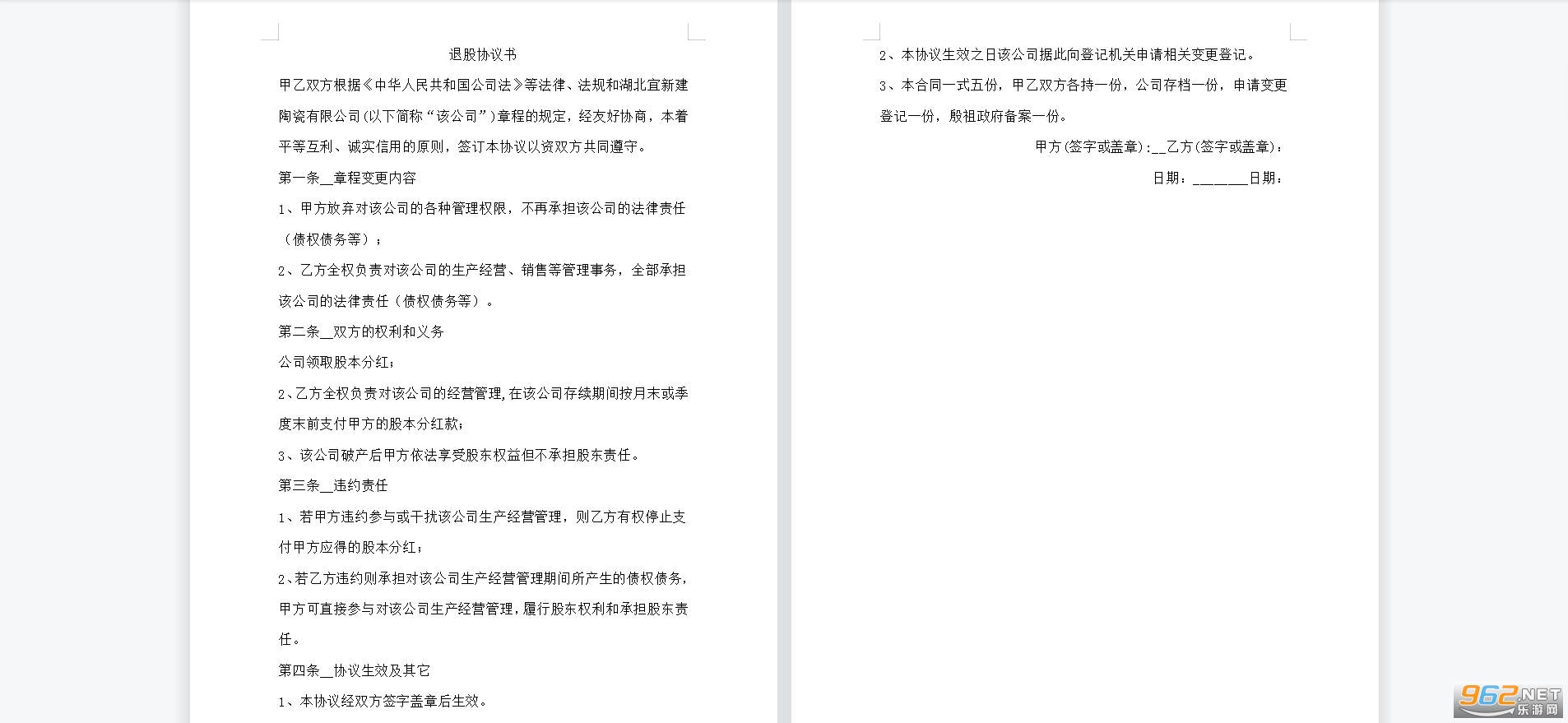 1、乙方自愿放弃所持有的公司所有股份,并将股份转让给甲方,由甲方另找他人入股。经公司财务核算向乙方返还人民币__元整(¥:__)。