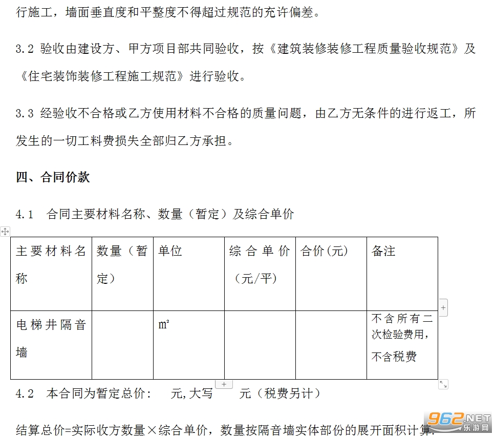 《隔音墙施工合同模板》是一款非常不错的施工合同模板,模板的内容还是很丰富的,而且条理十分的清楚,内容比较的简单,模板仅仅作为参考可以进行编辑,有表格的形式,感兴趣的亲们赶紧下载吧。
