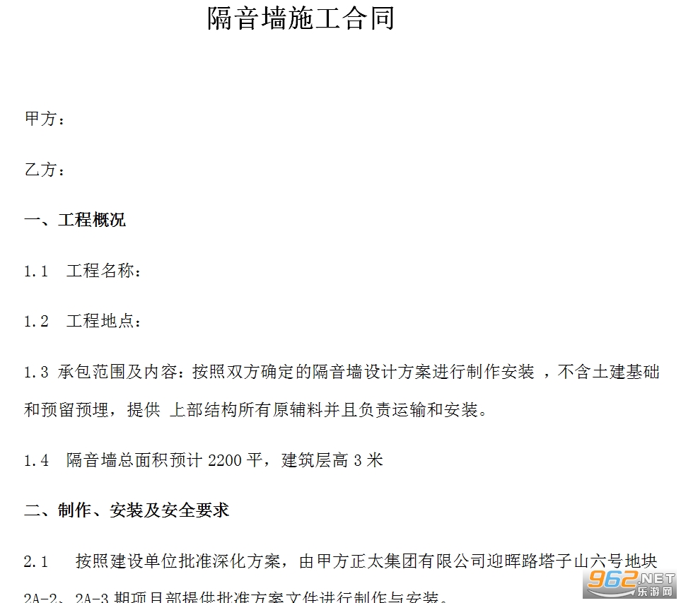 1.3 承包范围及内容:按照双方确定的隔音墙设计方案进行制作安装 ,不含土建基础和预留预埋,提供 上部结构所有原辅料并且负责运输和安装。