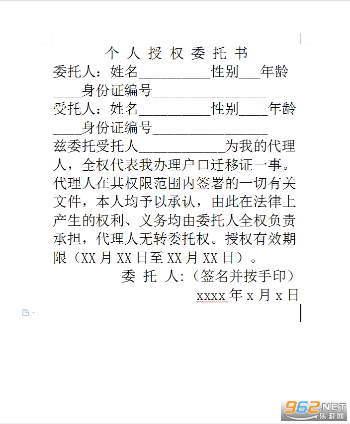 兹委托受托人____________为我的代理人,全权代表我办理户口迁移证一事。