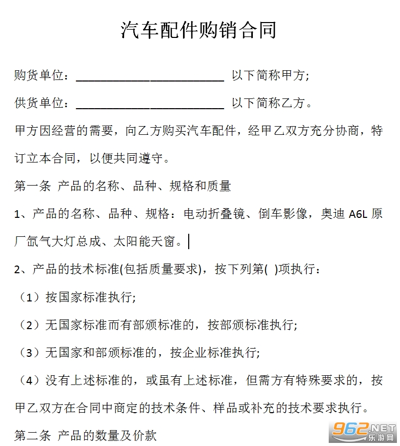 甲方因经营的需要,向乙方购买汽车配件,经甲乙双方充分协商,特订立本合同,以便共同遵守。