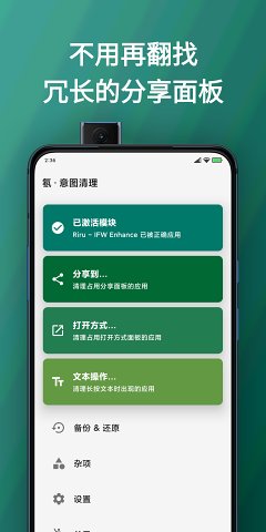 「氡·意图清理」是一款允许您清理分享面板和打开方式面板的应用,它借助 Magisk 模块 Riru - Core 和 Riru - IFW Enhance 来实现作用,当然 root 权限也是必需的。