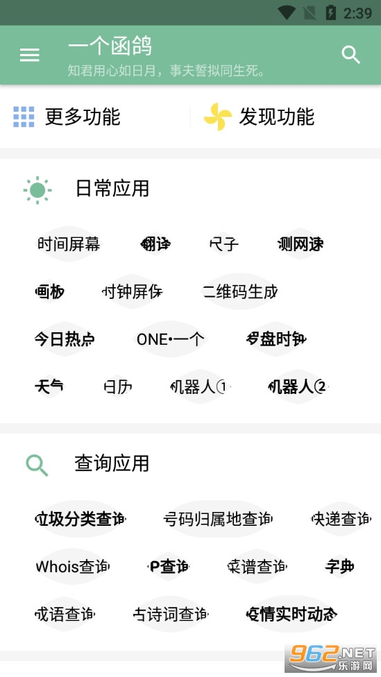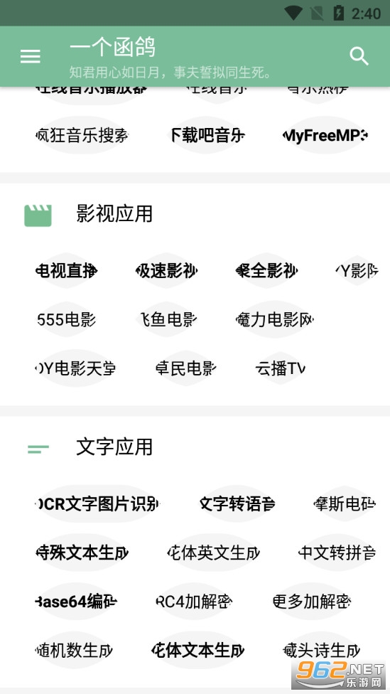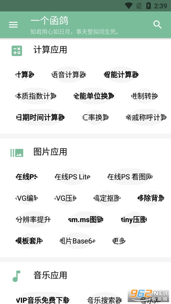 《一个函鸽》是一款为朋友们打造的多功能工具箱,进入一个函鸽app我们可以看到很多的功能,比如日常应用有着翻译、日历、天气等,计算栏目有着各种不同类型的计算器,音乐栏目有着多种免费下载音乐的渠道,还有着文字、图片等其他的应用模块可以使用。