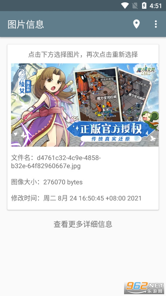 软件操作简单,进入界面后点击图标在手机中选择需要查看的图片,需要是原图,然后就可以看到一些基本信息,点击下面的查看更多可以查看到完整的Exif信息,点击右上角的位置图标可以查看图片的拍摄位置,有需要的朋友可以下载试试。