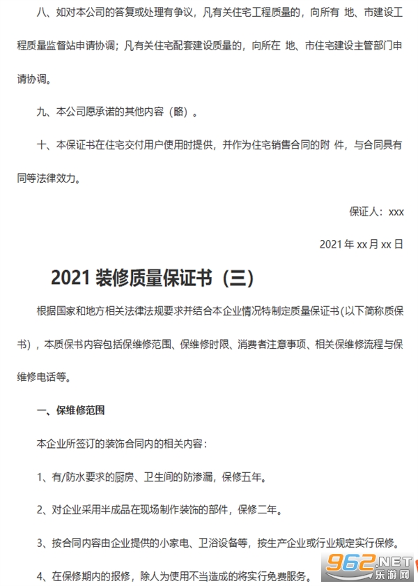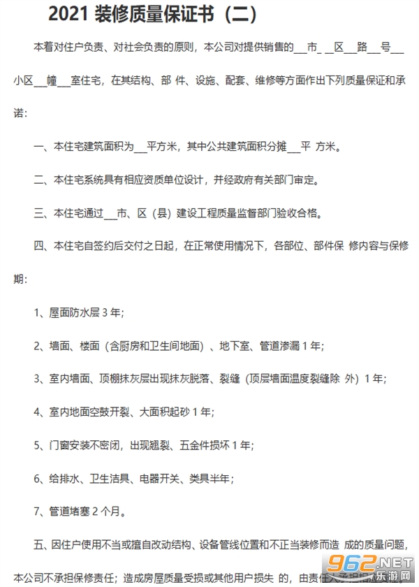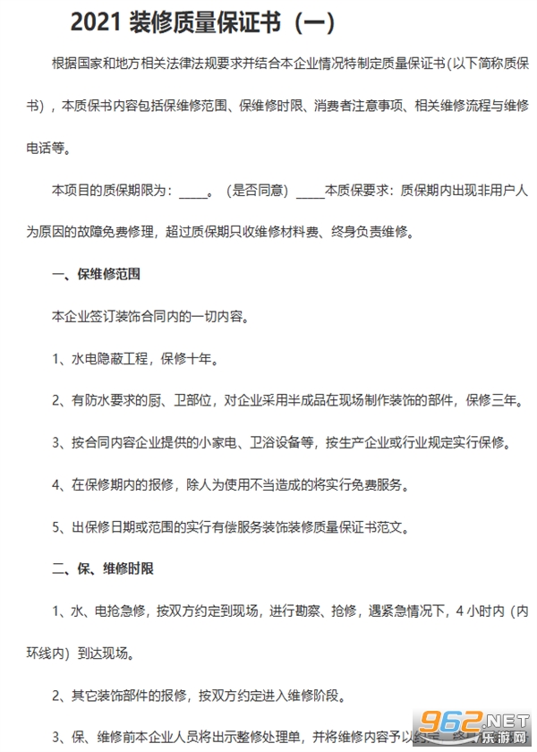 5、出保修日期或范围的实行有偿服务装饰装修质量保证书范文。