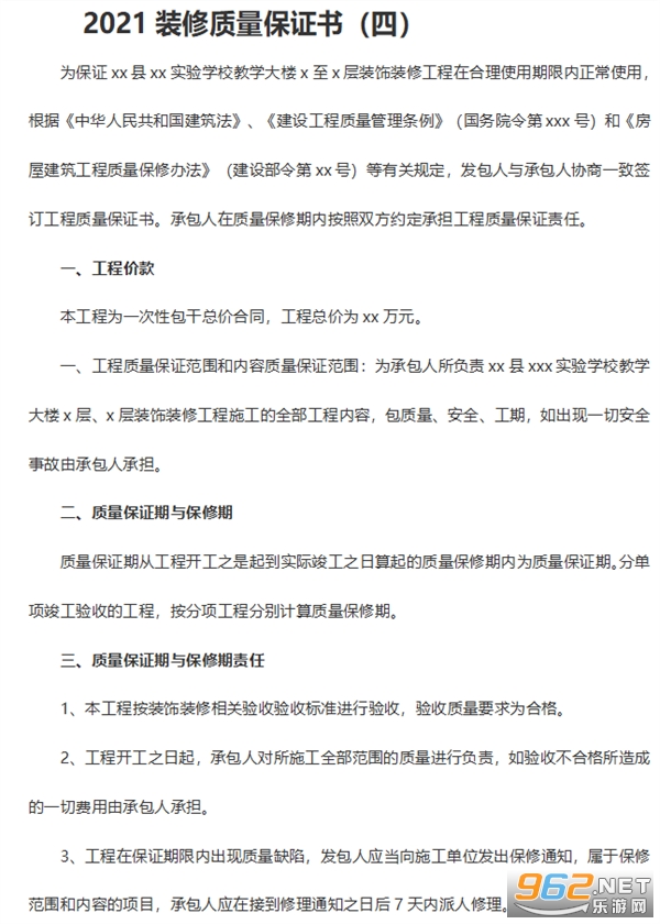 《装修质量保证书》中为大家带来4份装修质量保证协议文本,通过协议合同的方式来保证房子装修好之后的质量,内容非常完善,大家可以根据详细的情况在文档的基础上进行修改添加。有需求的话就快来看看吧!