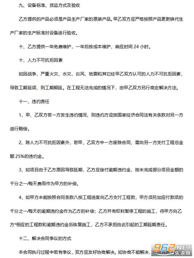 2、除人力不可抗拒因素外,若甲、乙双方中一方废除合同,需向另一方支付工程总金额25%的违约金。