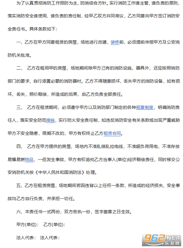 为了认真贯彻消防工作预防为主,防消结合方针。实行消防工作谁主管、谁负责的原则,落实消防安全谁使用、谁负责的责任制,经甲乙双方共同商议,乙方同意向甲方签订消防安全责任书。具体条款如下: