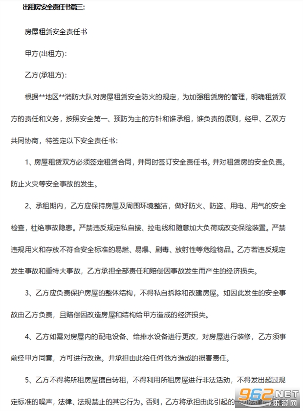 根据地区消防大队对房屋租赁安全防火的规定,为加强租赁房的管理,明确租赁双方的责任和义务,按照安全第一、预防为主的方针和谁承租,谁负责的原则,经甲、乙双方共同协商,特签定以下安全责任书: