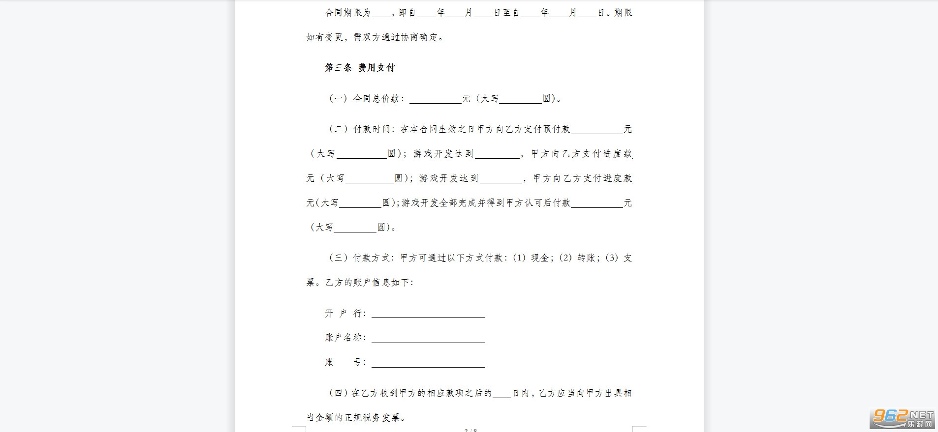 (二)付款时间:在本合同生效之日甲方向乙方支付预付款 元(大写圆);游戏开发达到,甲方向乙方支付进度款 元(大写圆);游戏开发达到,甲方向乙方支付进度款 元(大写圆);游戏开发全部完成并得到甲方认可后付款 元(大写圆)。