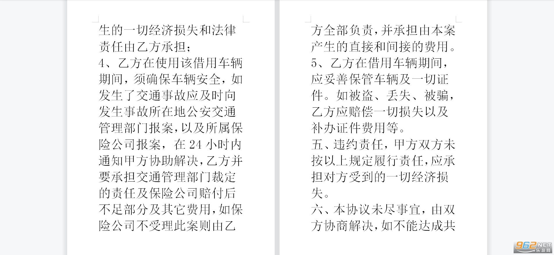 5、乙方在借用车辆期间,应妥善保管车辆及一切证件。如被盗、丢失、被骗,乙方应赔偿一切损失以及补办证件费用等。