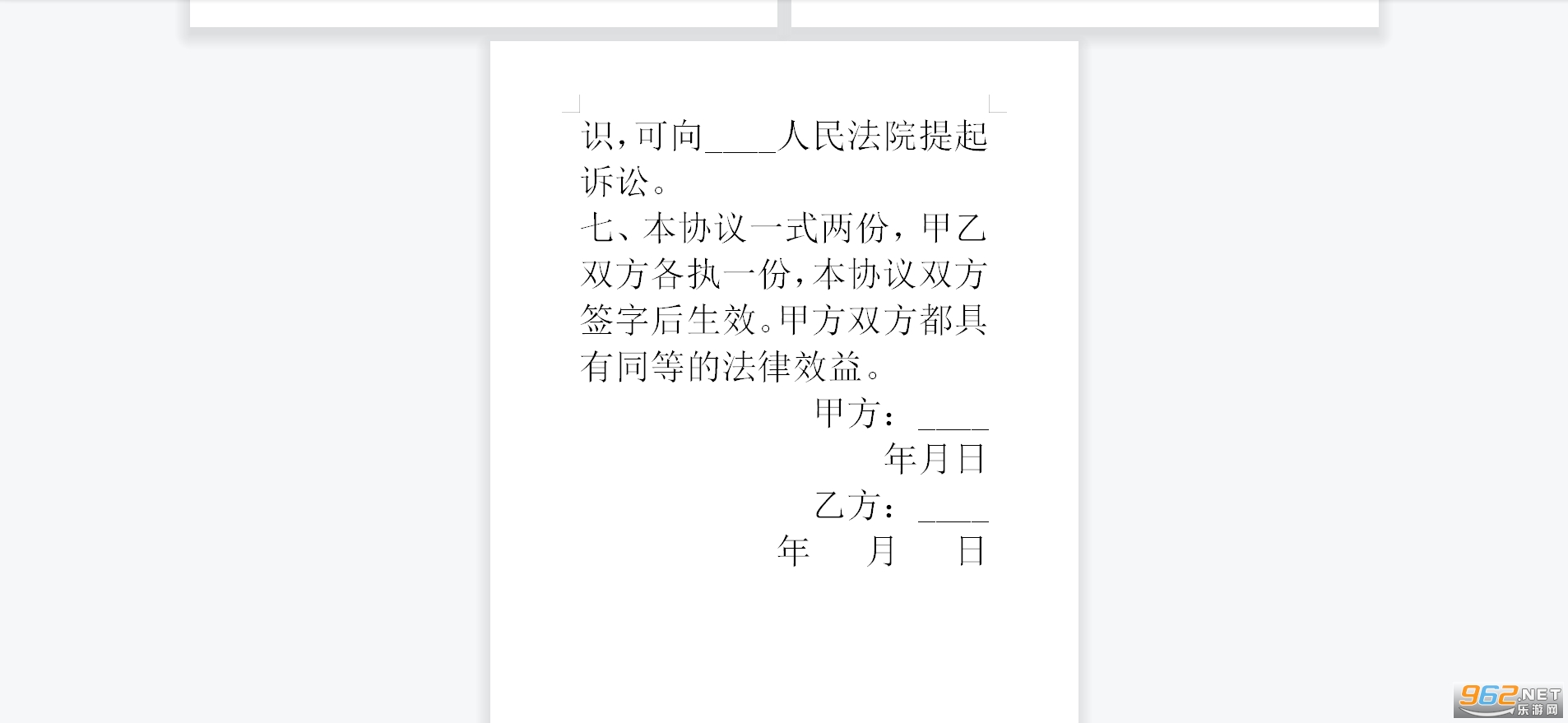 七、本协议一式两份,甲乙双方各执一份,本协议双方签字后生效。甲方双方都具有同等的法律效益。