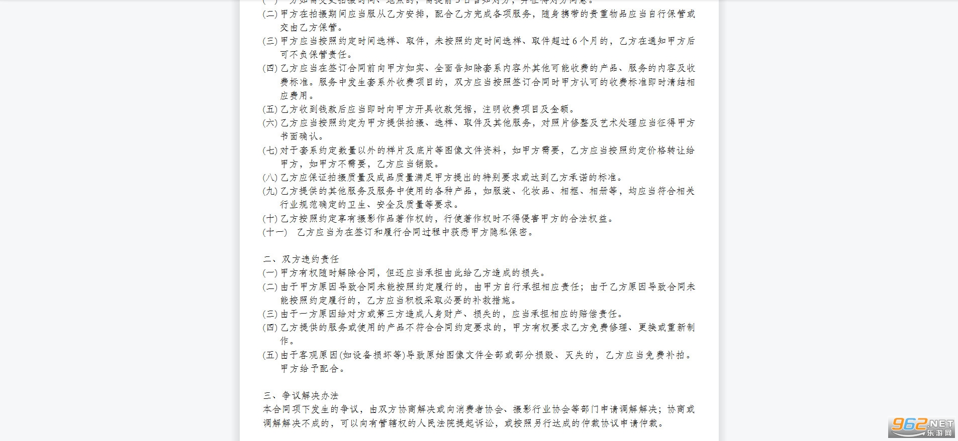 (六)乙方应当按照约定为甲方提供拍摄、选样、取件及其他服务,对照片修整及艺术处理应当征得甲方书面确认。