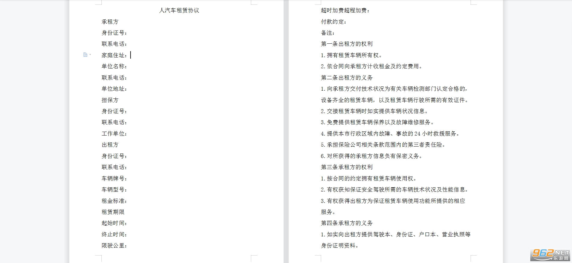 个人汽车租赁协议