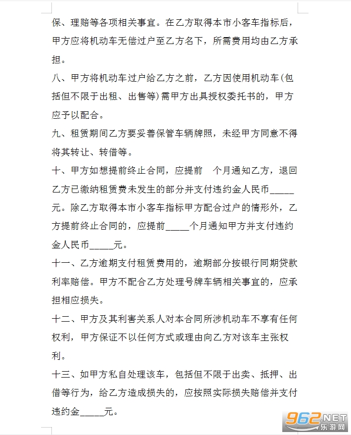 十、甲方如想提前终止合同,应提前个月通知乙方,退回乙方已缴纳租赁费未发生的部分并支付违约金人民币_____元。除乙方取得本市小客车指标甲方配合过户的情形外,乙方提前终止合同的,应提前_____个月通知甲方并支付违约金人民币_____元。