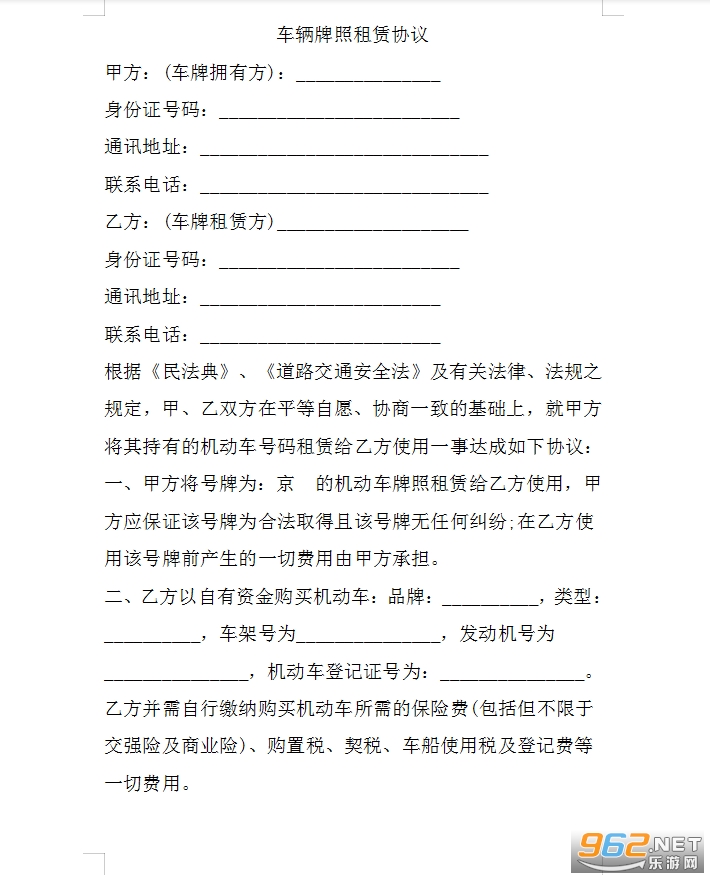 根据《民法典》、《道路交通安全法》及有关法律、法规之规定,甲、乙双方在平等自愿、协商一致的基础上,就甲方将其持有的机动车号码租赁给乙方使用一事达成如下协议: