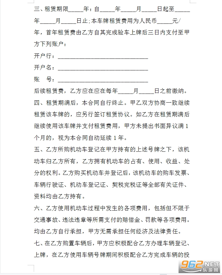 三、租赁期限_____年:自_____年_____月_____日起至_____年_____月_____日止;本车牌租赁费用为人民币_____元/年,首年租赁费由乙方自其完成验车上牌后三日内支付至甲方下列账户: