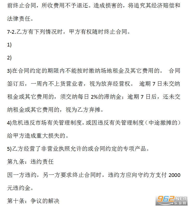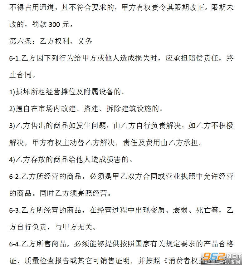 6-5.乙方必须按照市场规定上下班,营业时间内脱岗造成商品丢失、财产损失的由乙方自负。在合同期内,持续5天不正常营业的,合同自行终止,所交租金不予退还。