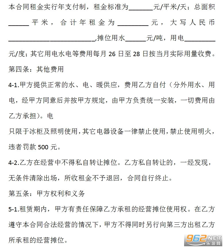 本合同租金实行年支付制,租金标准为_______元/平米/天;总面积______平米,合计年租金为_________元,大写人民币_________________________,摊位用水______元/吨,用电_________元/度;其它用电水电等费用每月26日至28日按当月实际用量收费。