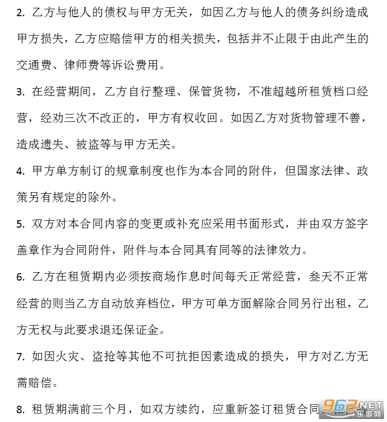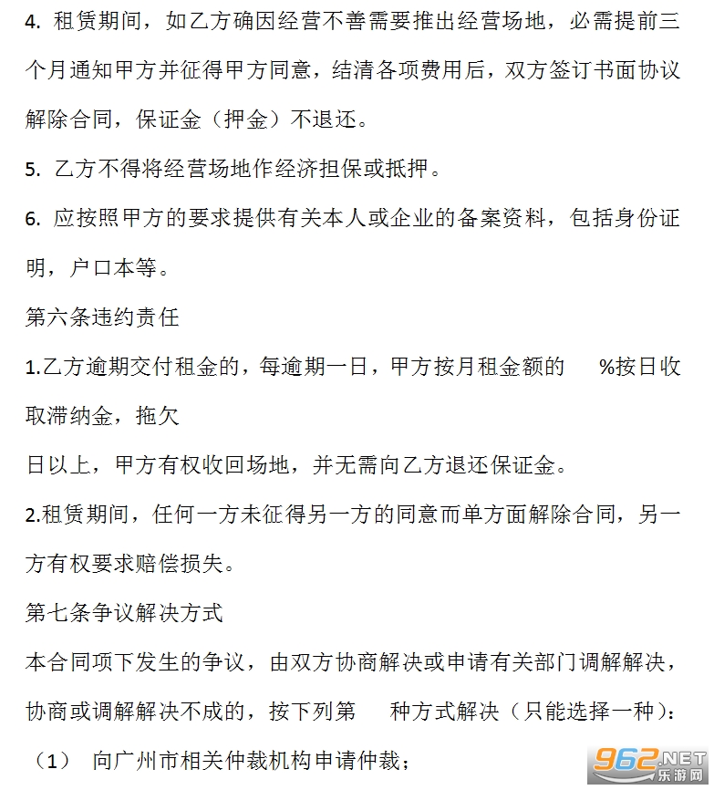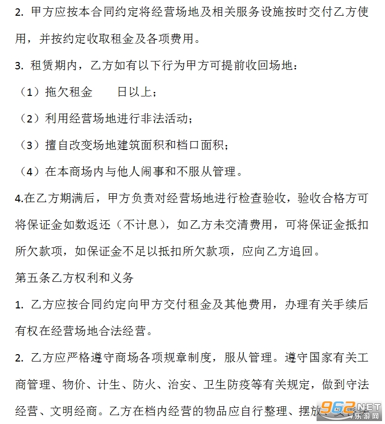 4.在乙方期满后,甲方负责对经营场地进行检查验收,验收合格方可将保证金如数返还(不计息),如乙方未交清费用,可将保证金抵扣所欠款项,如保证金不足以抵扣所欠款项,应向乙方追回。