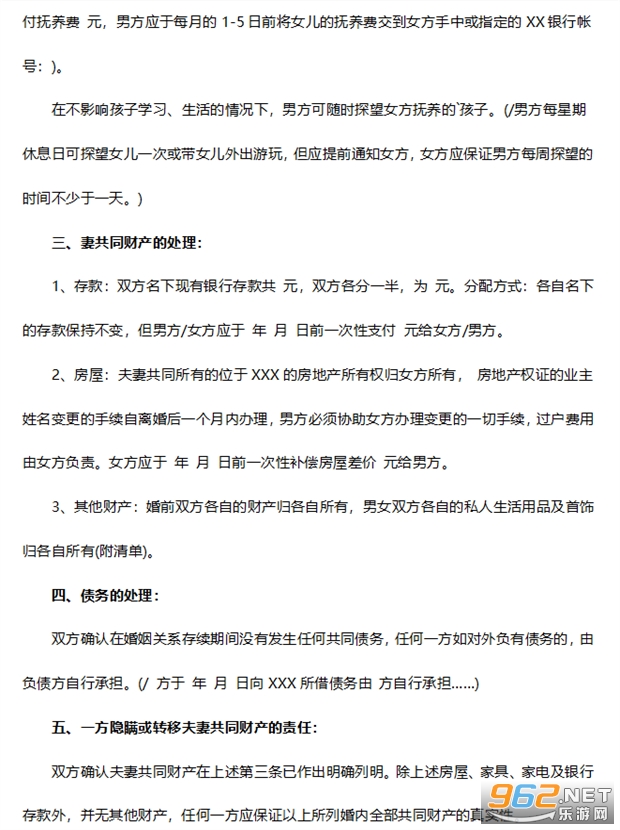 1、存款:双方名下现有银行存款共 元,双方各分一半,为 元。分配方式:各自名下的存款保持不变,但男方/女方应于 年 月 日前一次性支付 元给女方/男方。