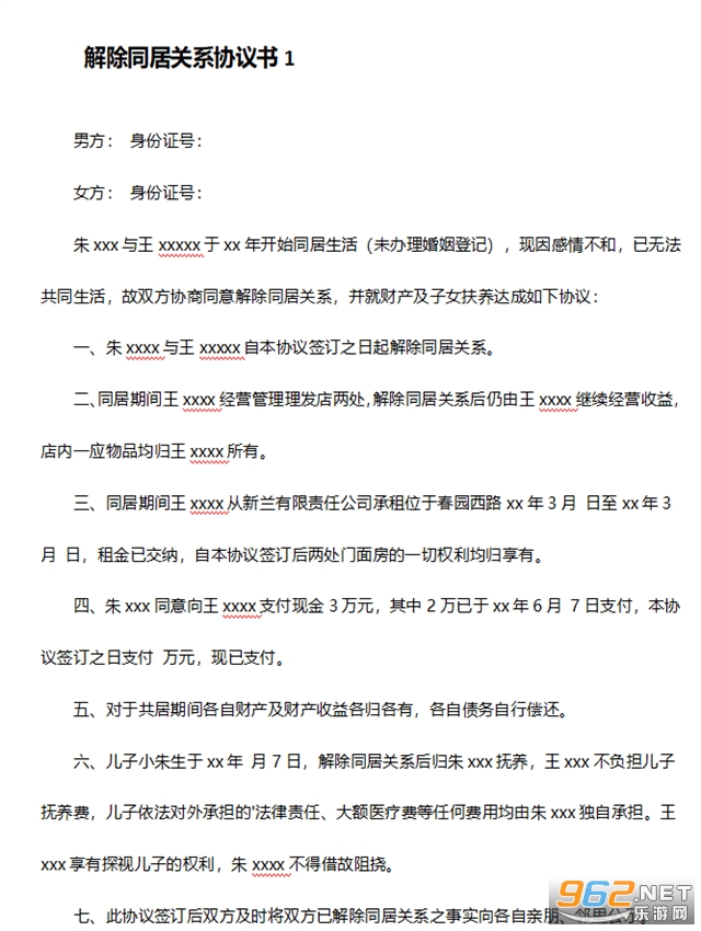 一、朱xxxx与王xxxxx自本协议签订之日起解除同居关系。