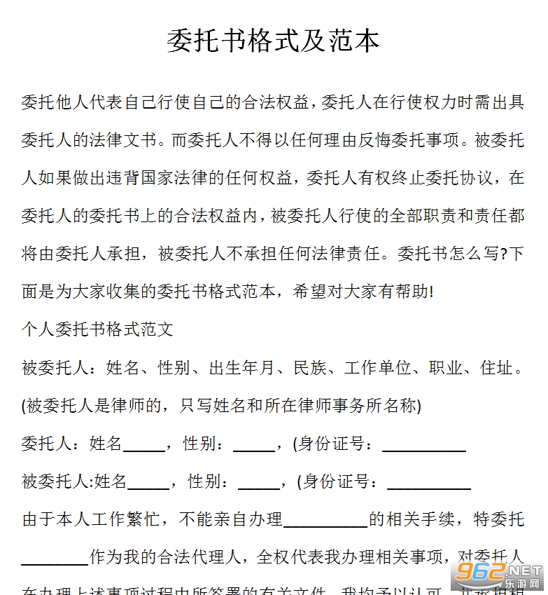 《委托书格式及范本》是小编在网上收集到的很齐全的关于各种不用的委托书的格式以及范本,里面涉及到的一些要素大家可以作为参考,排版可能会有点乱,摘选自己需要的观看即可,模板仅供参考,感兴趣的亲们赶紧下载吧。
