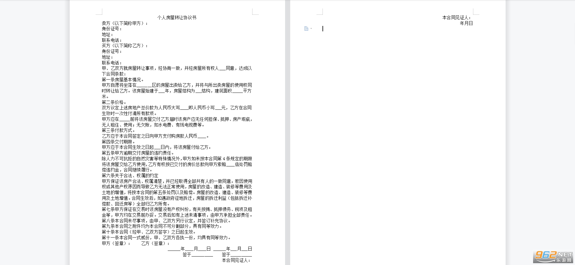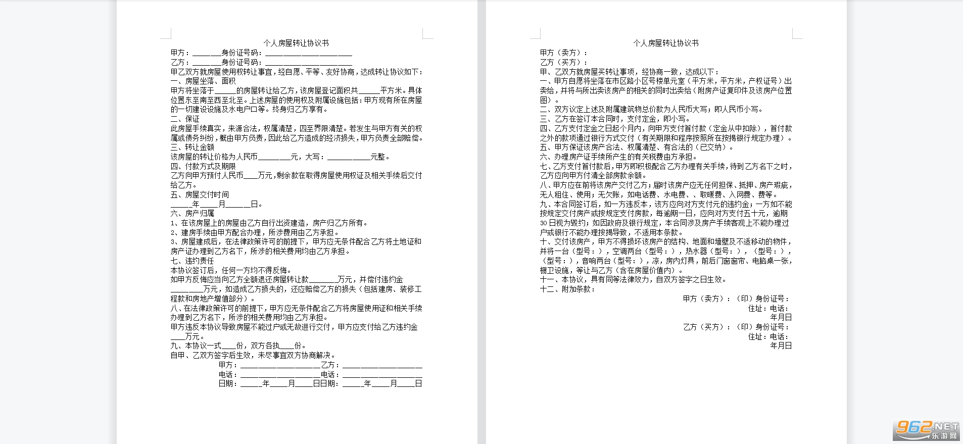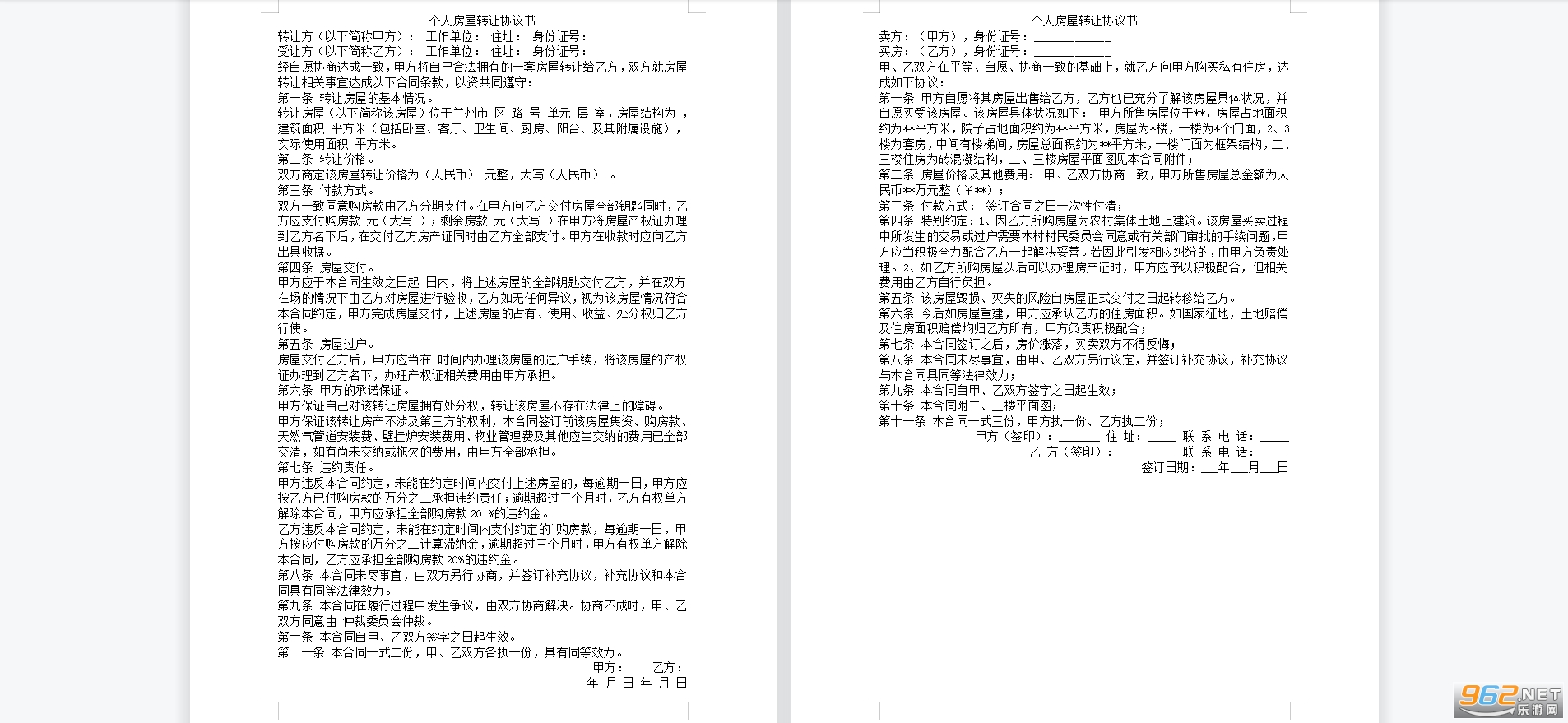 个人房屋转让合同协议书书写格式