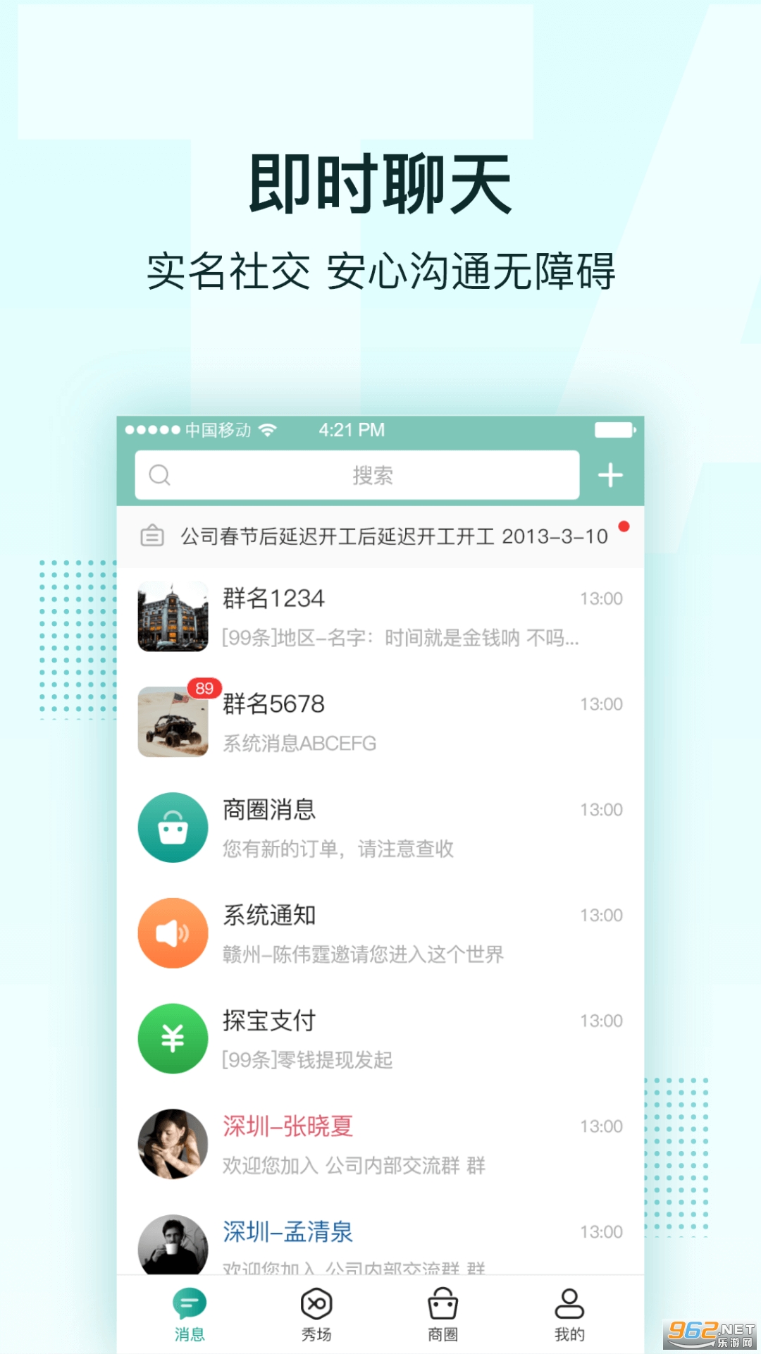 探宝是一个前台实名制的社交软件,每位用户在其中所展示的都是身份证件上的真实姓名和发证地区,您可以按地区或姓名查找任何一位用户并直接与之沟通。前台实名的做法,从客观上激发了用户的责任感和荣誉感,满足了网络时代的人们对社交及安全的双重需求。
