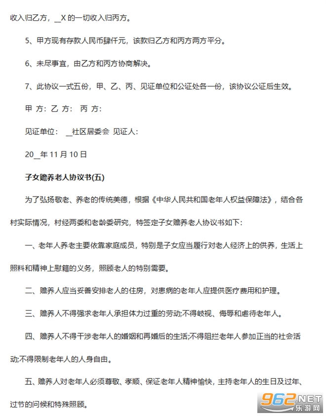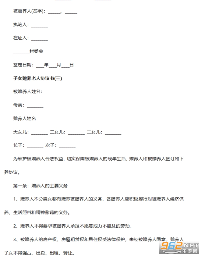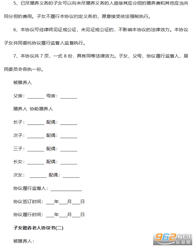 2、本协议生效后,子女必须切实遵守,赡养关系不存在时自然终止。本协议未尽事宜,由各方签署补充协议进行约定。补充协议与本协议具有同等法律效力。未达成补充协议的参照《老年人权益保障法》执行。