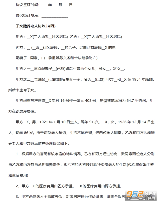甲方__X,男、1921年1月10日生人,现年91岁。__X,女、1926年12月14日生人,现年86岁。由于两位老人年迈,生活不能自理,经两位老人同意,乙方和丙方达成赡养老人和甲方身后财产处理协议如下:
