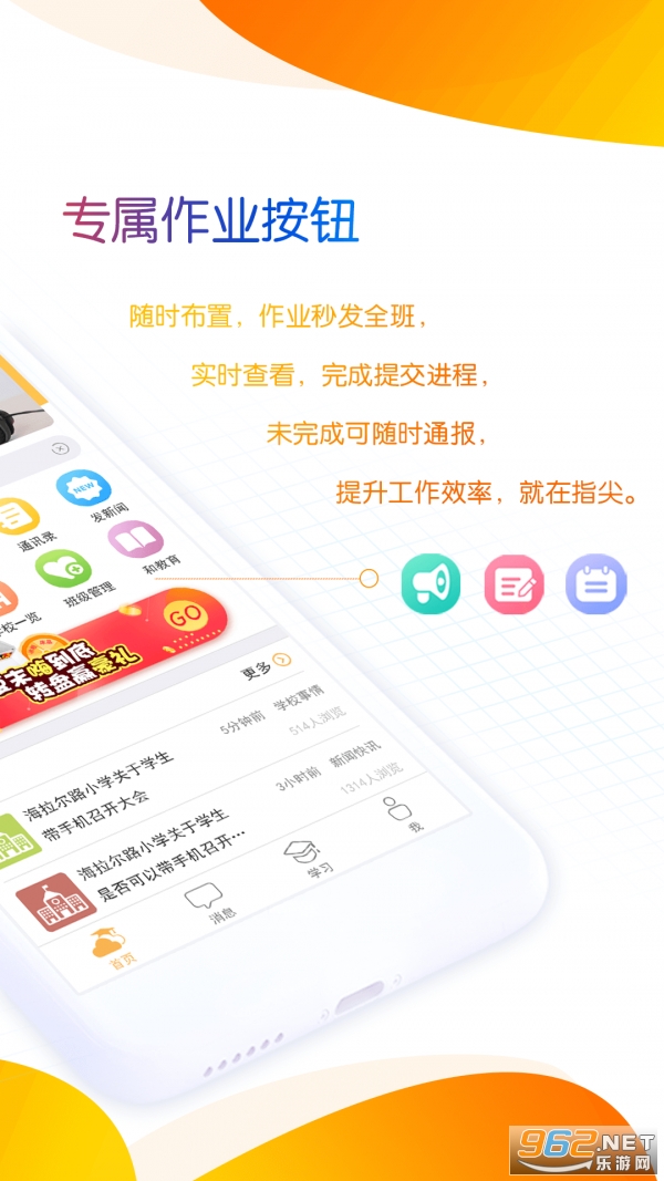 家校互动核心升级。快捷推送公告、单聊、群聊、图文、语音……通讯录内全部成员随心对话,互动畅聊!
