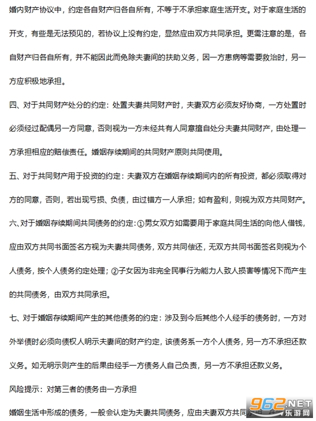 四、对于共同财产处分的约定:处置夫妻共同财产时,夫妻双方必须友好协商,一方处置时必须经过配偶另一方同意,否则视为一方未经共有人同意擅自处分夫妻共同财产,由处理一方承担相应的赔偿责任。婚姻存续期间的共同财产原则共同使用。