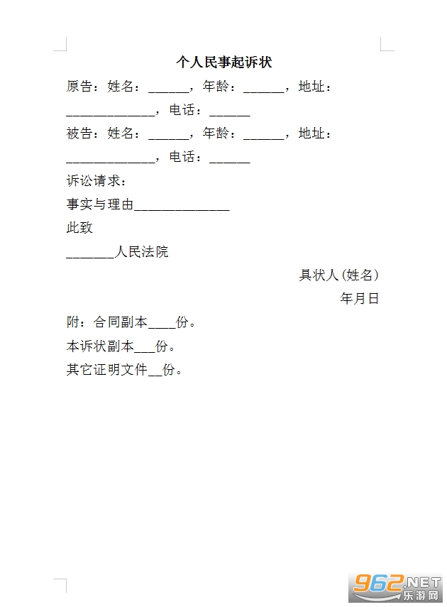 原告:姓名:______,年龄:______,地址:_____________,电话:______