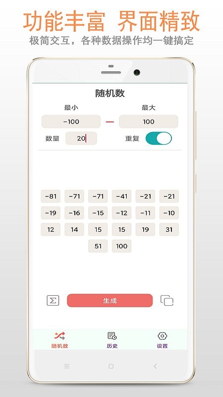 主界面快速设置最小最大值、所需随机数数量以及是否允许重复
