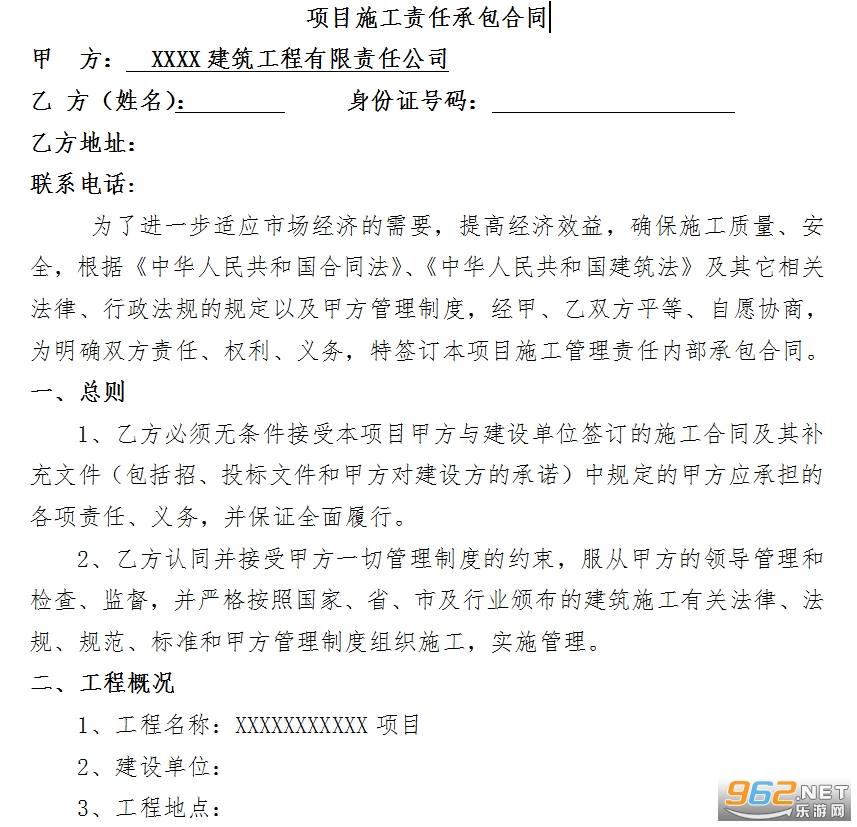 2、按本合同约定,乙方自愿承担本工程项目的施工承包责任管理,乙方是本工程项目施工组织、管理、指挥和施工质量、安全、经济、法律的第一责任人。